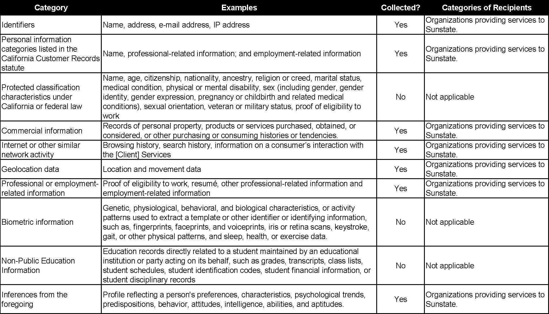Sunstate collects and processes information from you for human resource, employment, and benefit administration purposes, and where necessary to comply with any local, state, and federal legal obligations. We obtain the categories of personal information listed below directly from you and the information you provide during your job application process, with our clients, or with our recruiters, your employee onboarding process, and during the selection of your benefits as an employee. In some cases, we may obtain a background check and/or consumer report from a consumer reporting agency once an offer of employment is made. Such information includes, by way of example, name, alias and other names, age, race, color, national origin, citizenship, marital status, physical or mental disability, sex (including gender, gender identity, or gender expression), veteran or military status, email address, telephone or mobile phone number, address, Social Security Number, driver’s license number or state ID card number, passport number, sign-in and device information, including username and password, account name or number, and other online or device identifiers, educational, professional, and employment-related information, financial information, such as banking information for direct deposit, debit card number, credit card number, tax selections, pay rate, payroll deduction information, geolocation data, including badge access, and biometric information, including fingerprints. We only retain personal information about you for as long as necessary to fulfill the purposes we collected it for, as required to satisfy any legal, accounting, or reporting obligations.